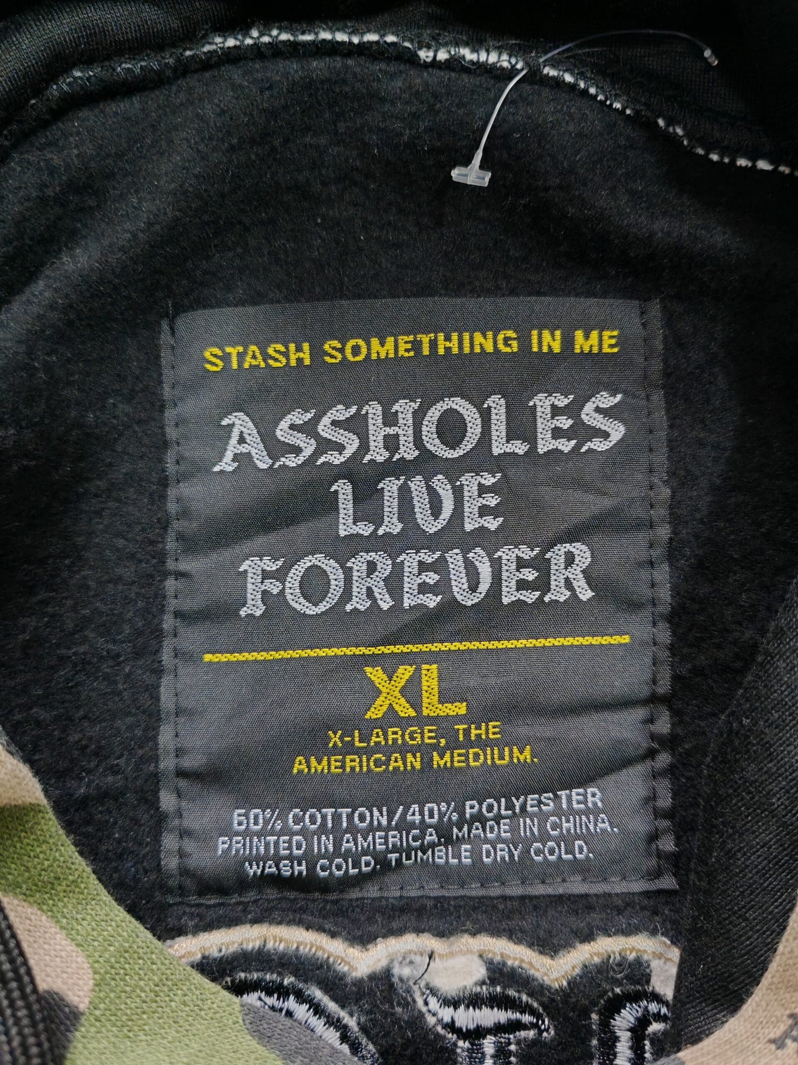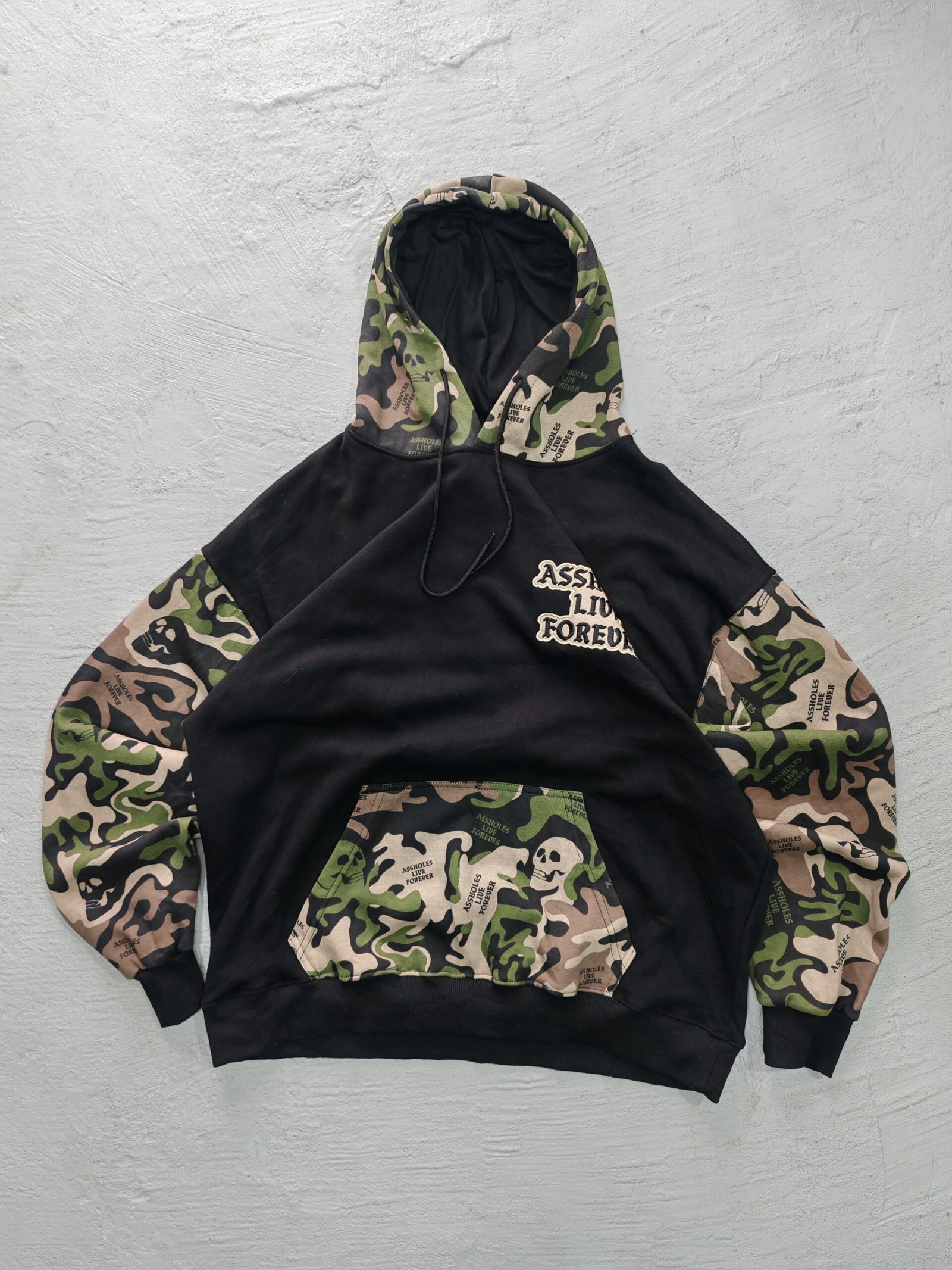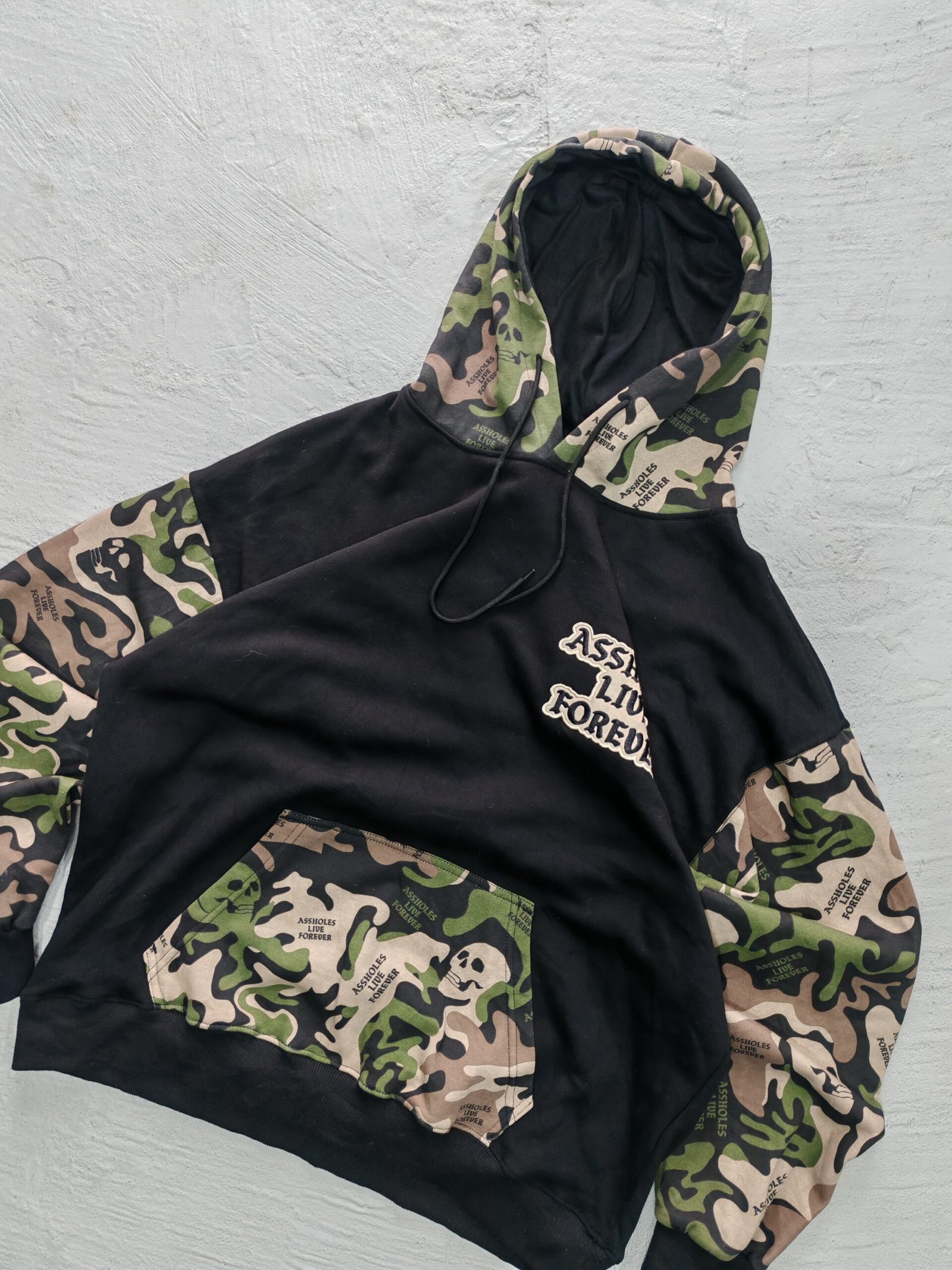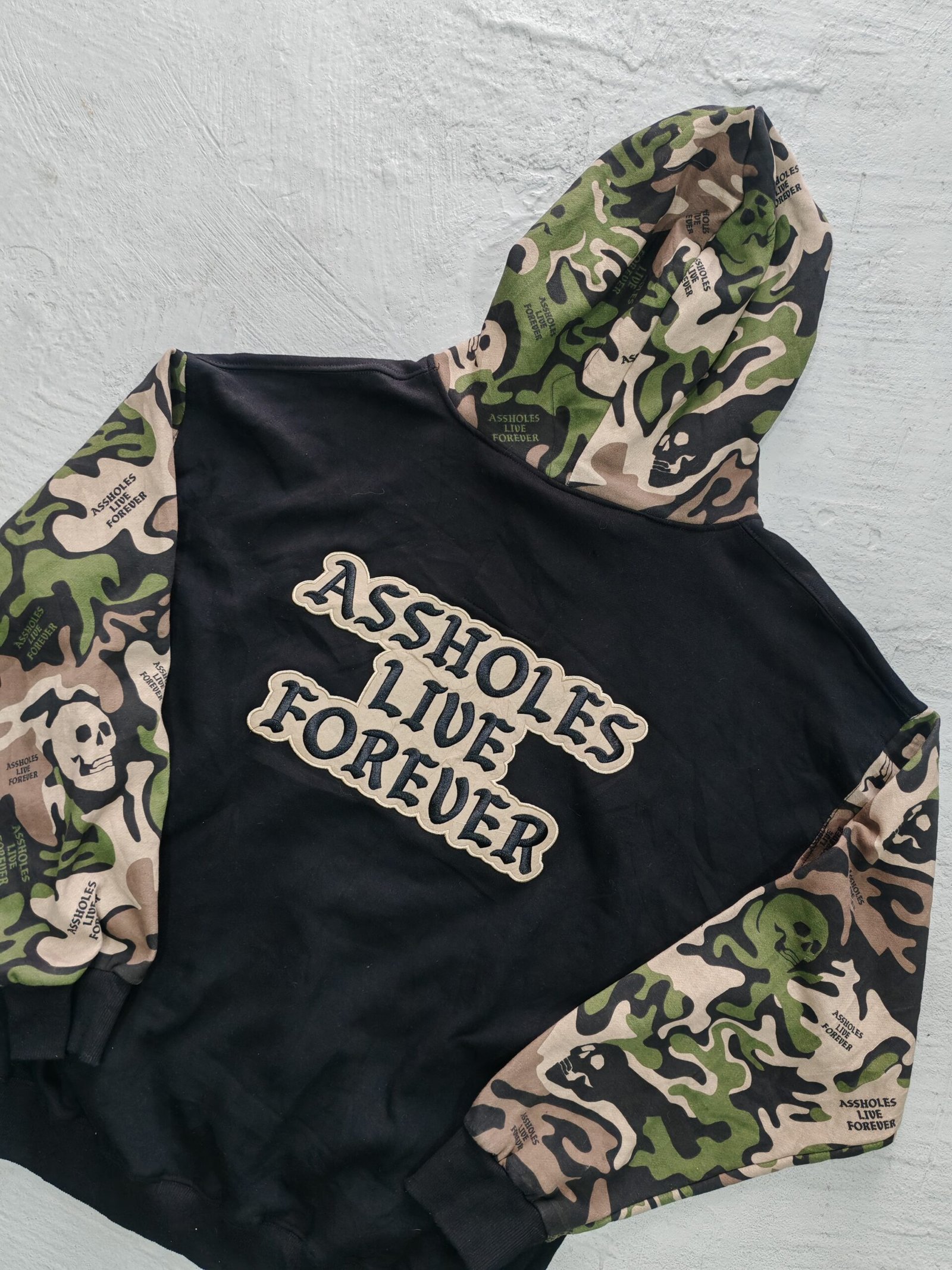 Hoodie con capucha con estampado camo en las mangas y bordados de ambos lados, un corte overzice, sin detalles en manga o cuellos, color en buen estado