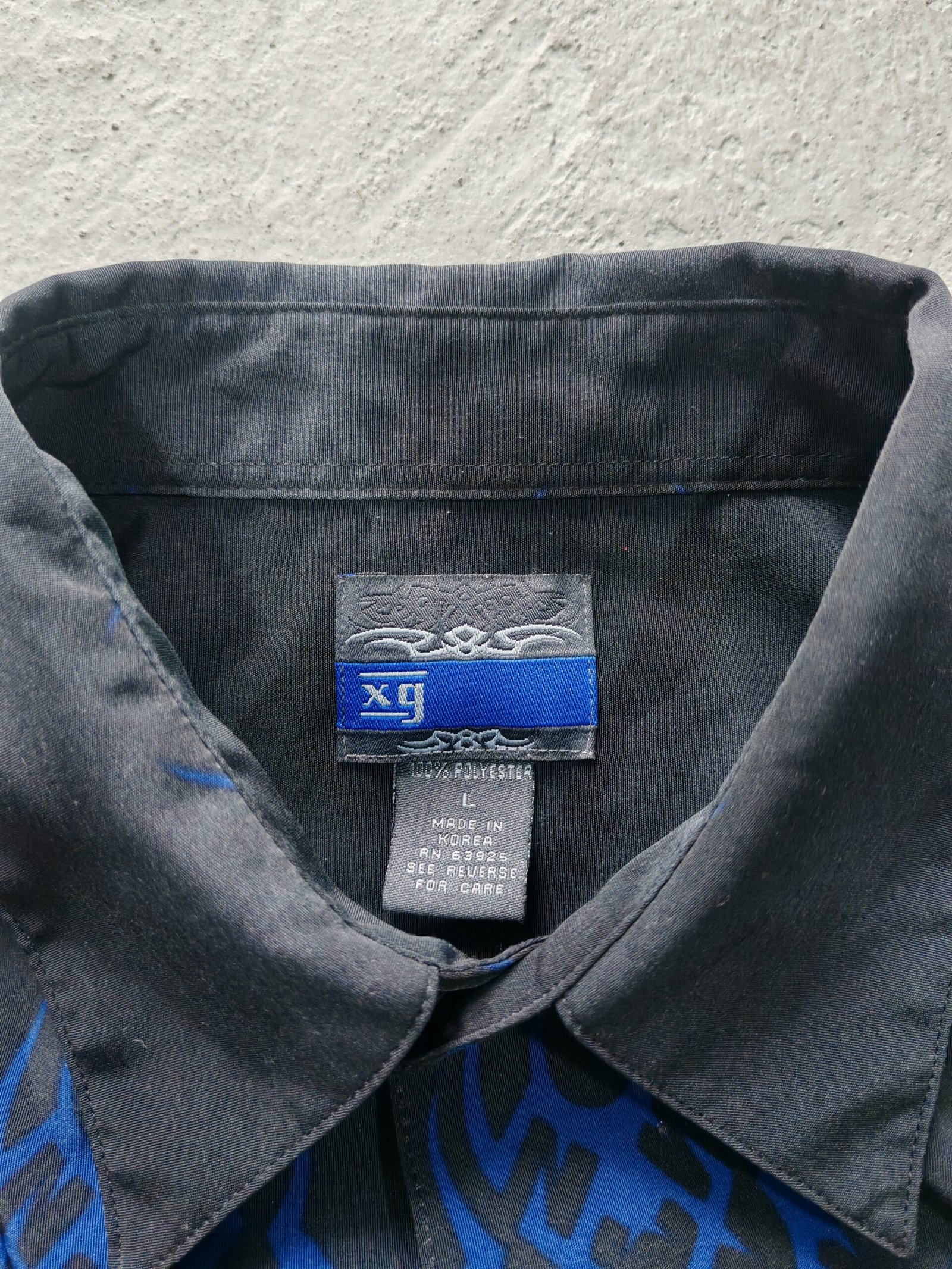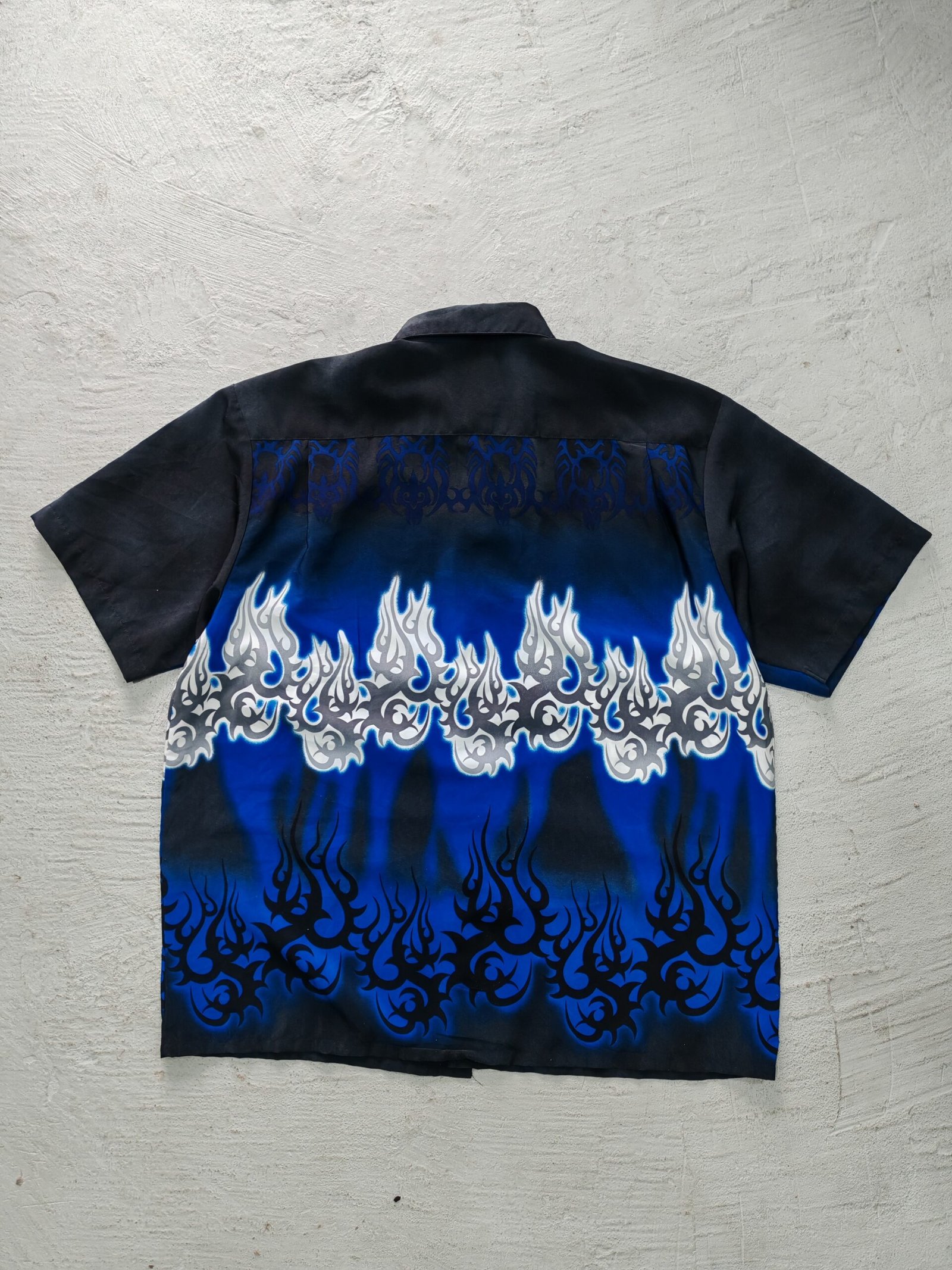 camisa a botonoes de poliester de la marca extreme gear presenta un diseño de ambos lados grafico de llamas e tonos azules y negros.