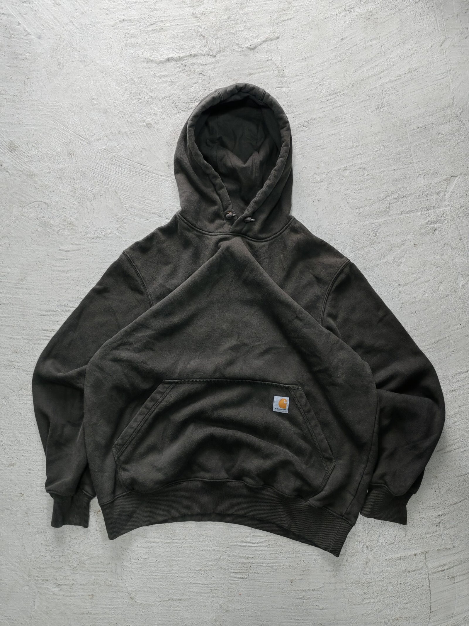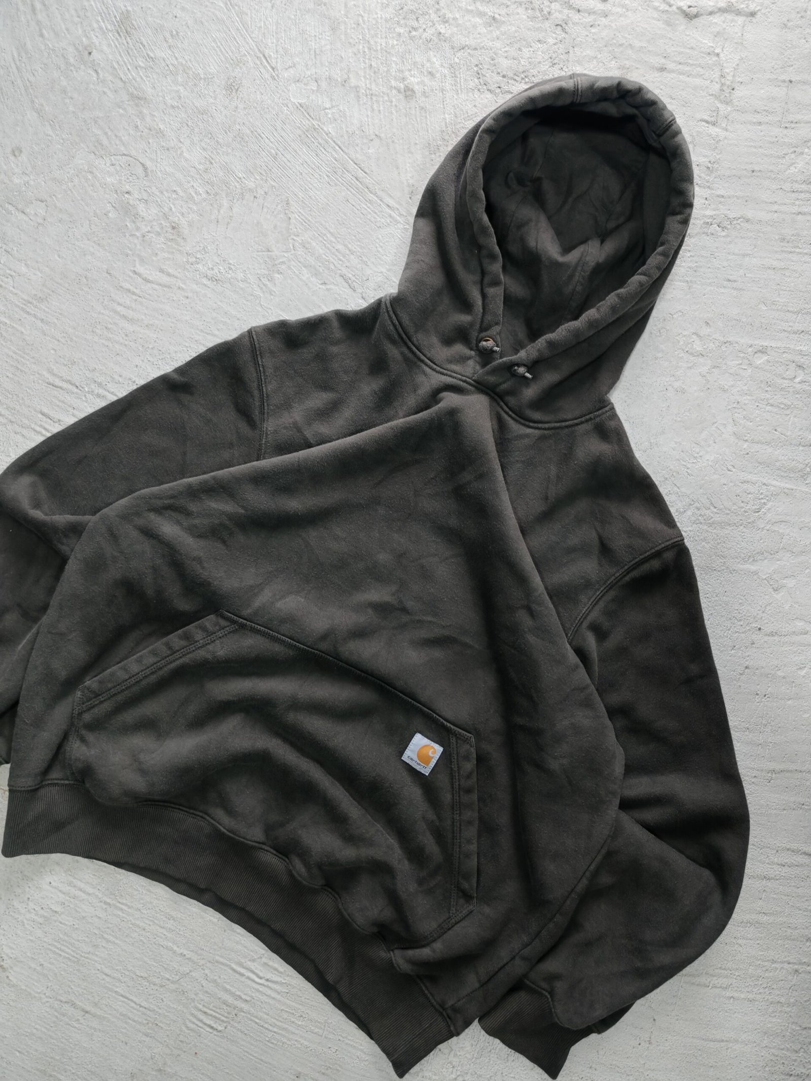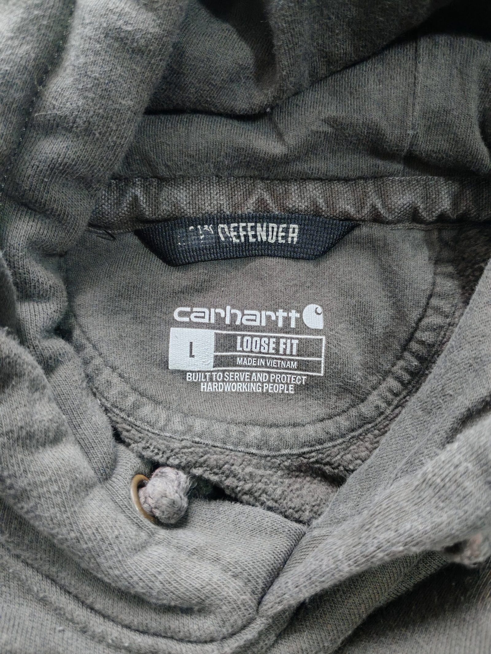 hoodie carhart en un verde olivo, con un corte lose fit, tags en buenas condiciones, sin detalles en manga o cuello, leve desgaste en la tela en general.