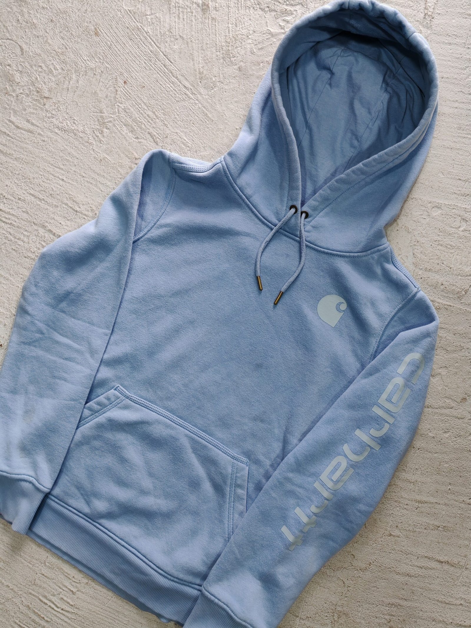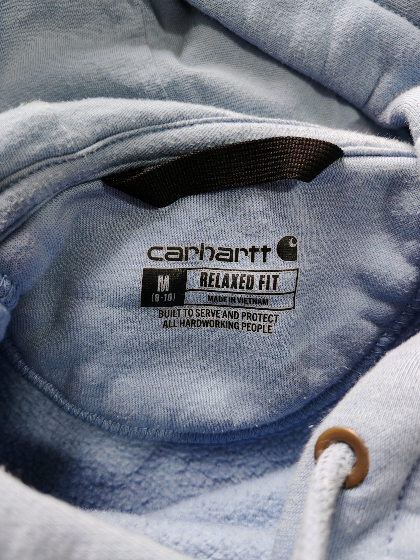 una hoodie con capucha de la marca carhartt Talla M (regular fit) en un tono celeste con estampado en la manga, tiene un desgaste general de la tela visble en fotos, ajustable de capucha.