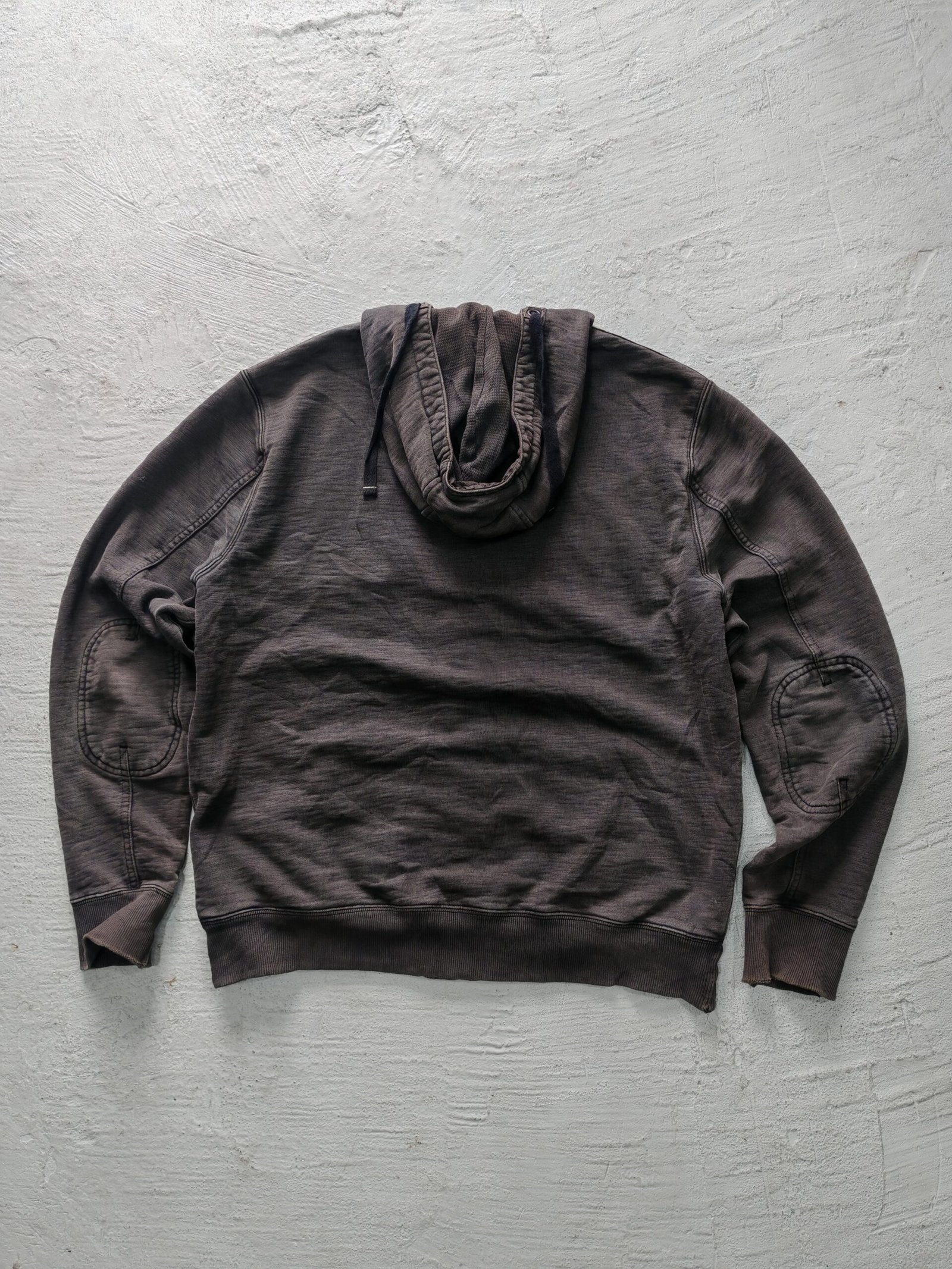 Hoodie basico en tono gris sin marca, tela pesada sin detalles, ajustable de gorro con coderas, talla L