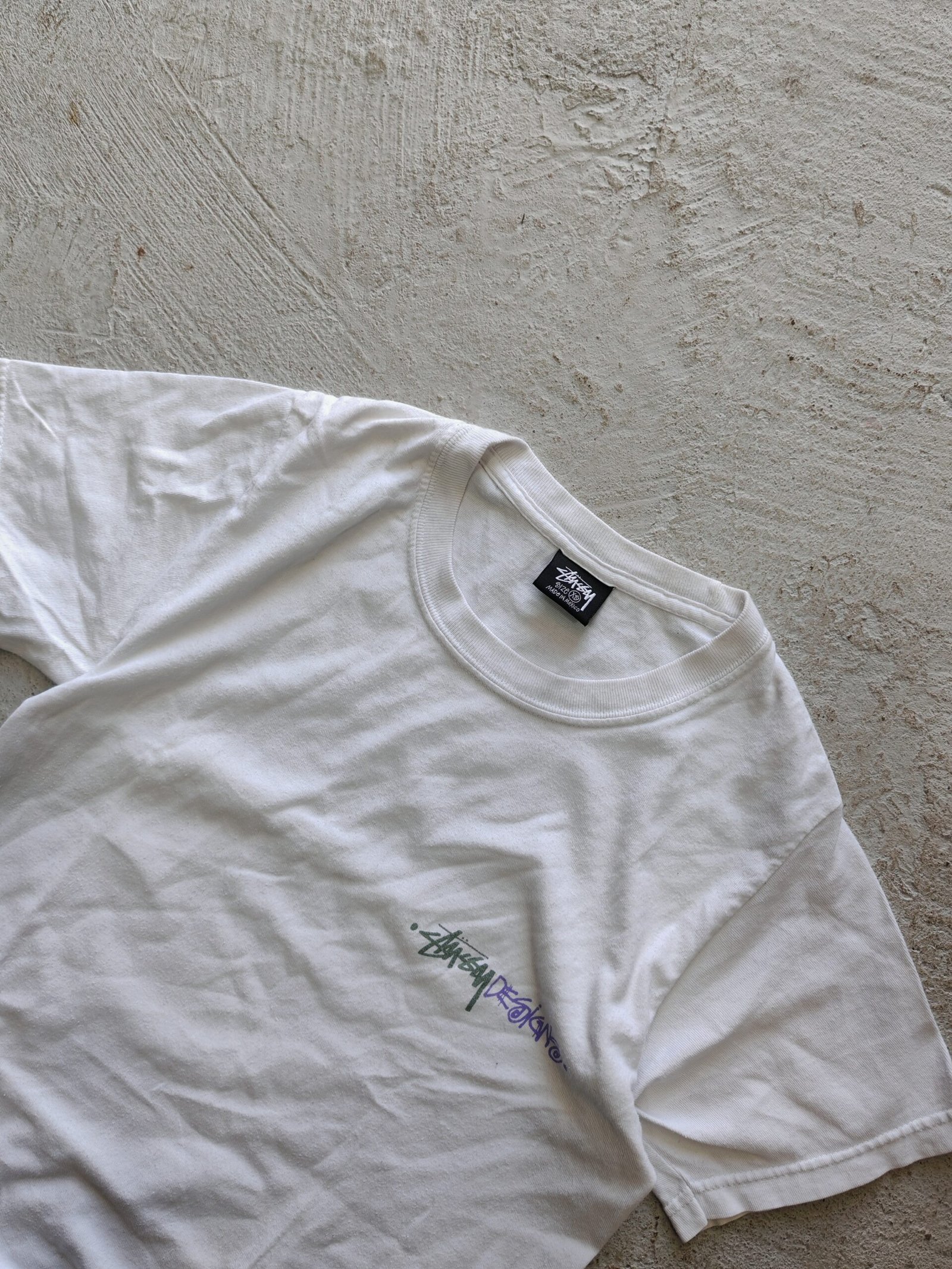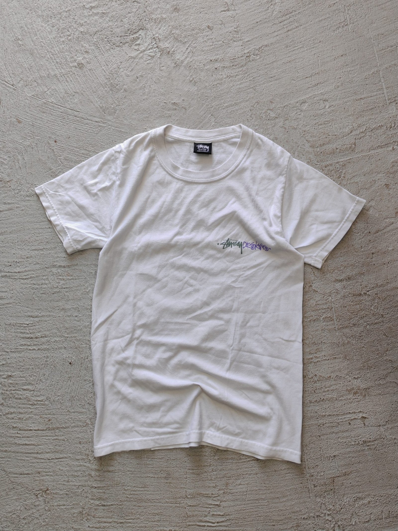 playera stussy color blanco print de ambos lados con logo y tags intactos talla S, print en tonos morados y verdes, sin detalles.