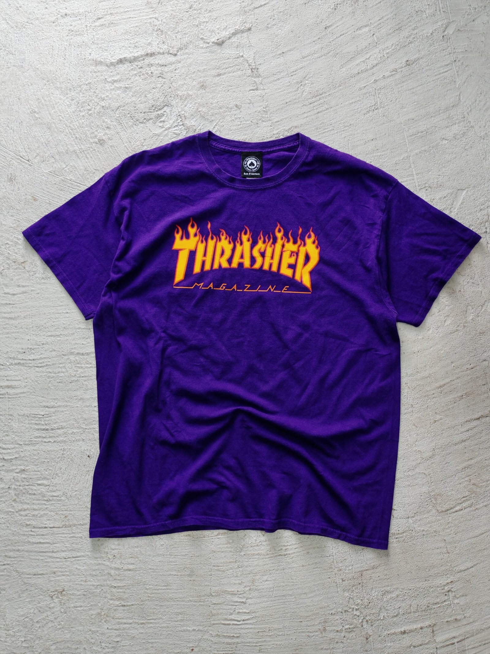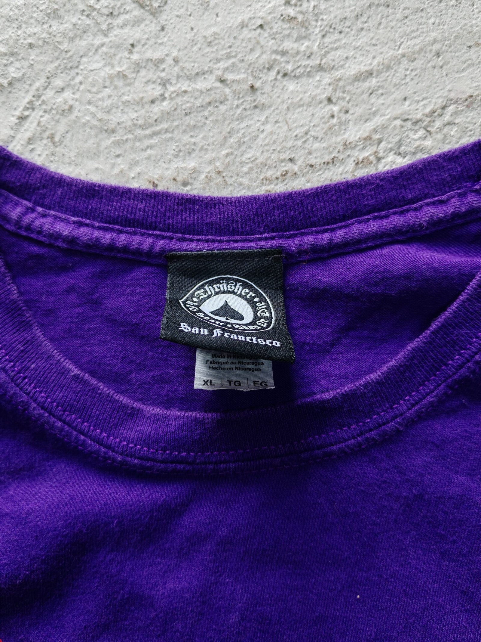 t-shirt thrasher talla XL, no tiene ningun detalle, estampado en excelente estado, sin desgaste, tags intactos, un coloro chulo en morado.